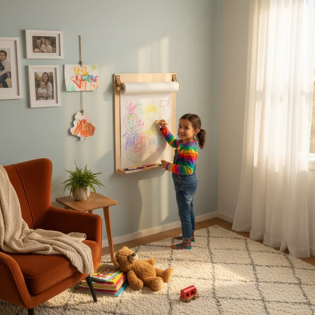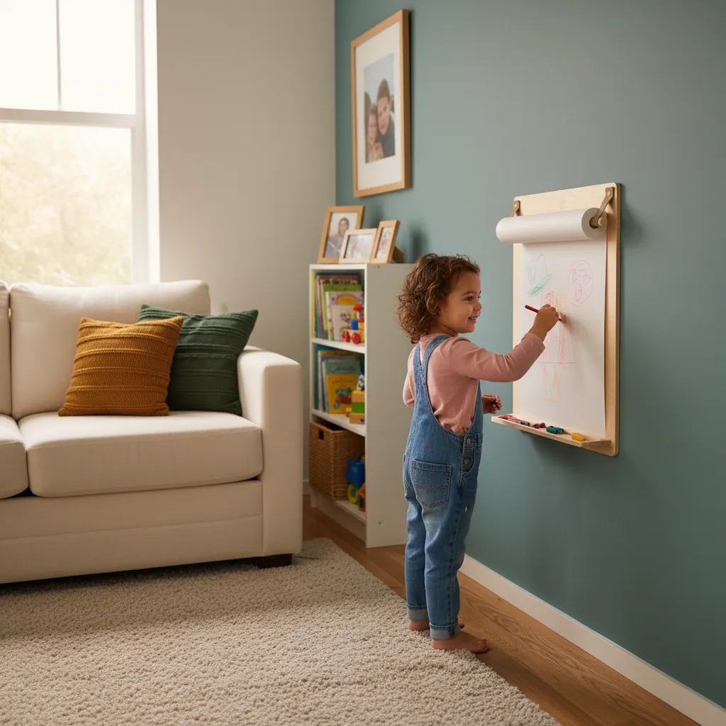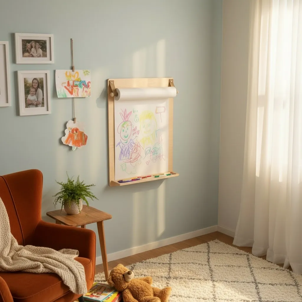 Es lässt sich an jeder Wand montieren und verfügt über eine integrierte Ablage, in der Stifte und Wachsmalkreiden ordentlich verstaut werden können.
