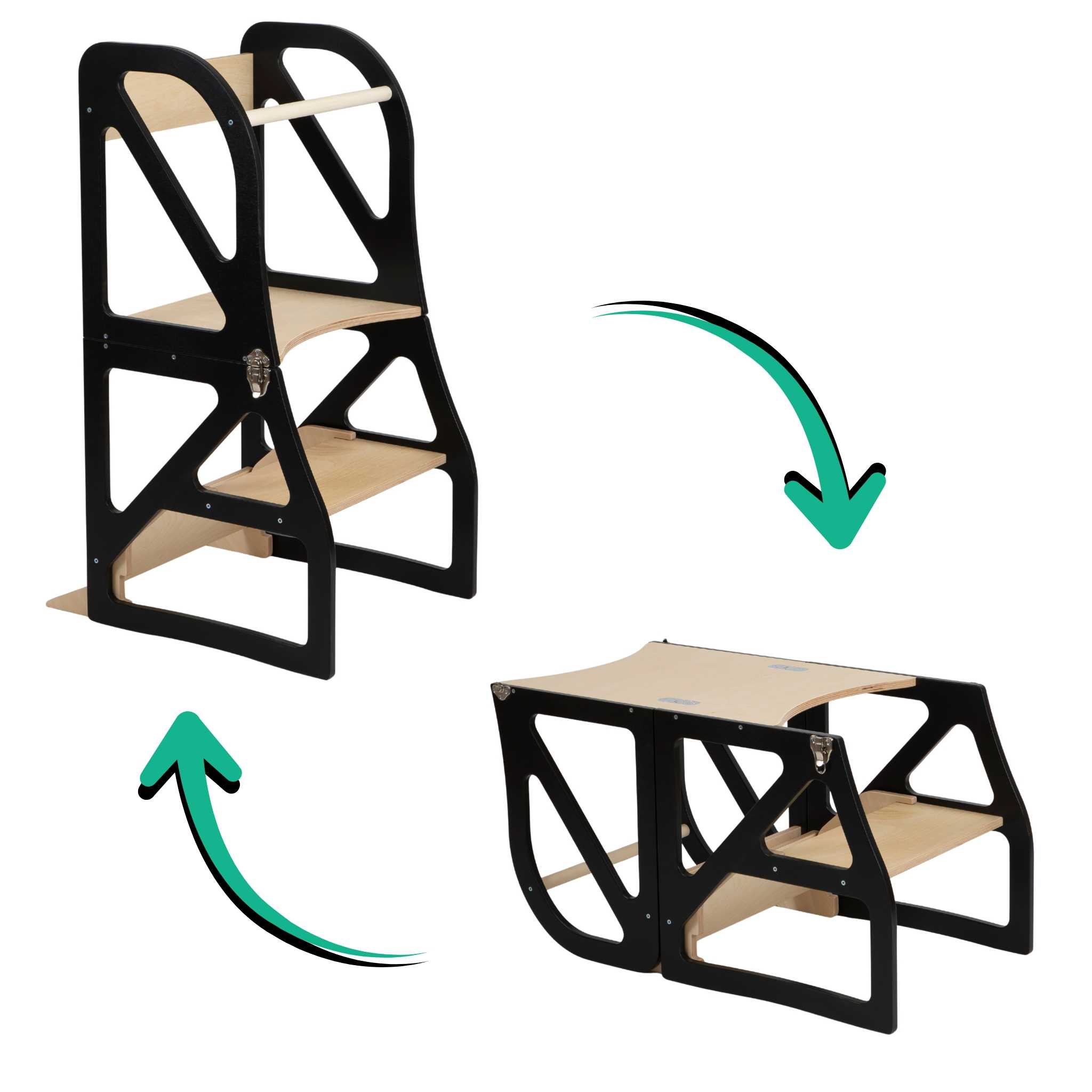 • Transformable Design: Quickly switches between a kitchen helper tower, toddler table, and chair set