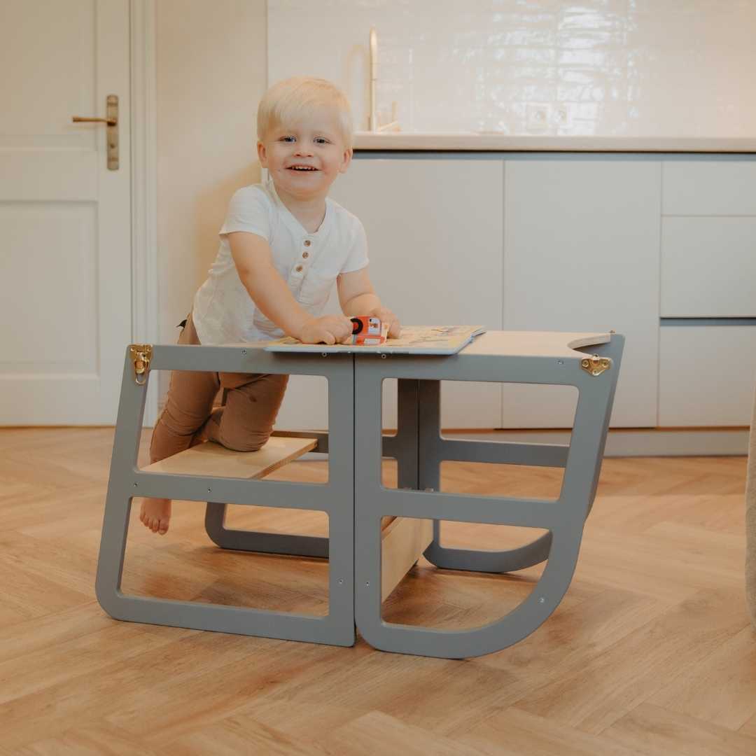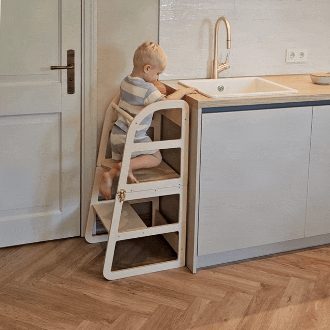 The Transformable Kitchen Tower Sleekstep is a multifunctional learning tower designed to grow with your child. It easily converts from a standing kitchen tower into a toddler table and chair set, supporting everyday activities like helping, playing, and independent learning.