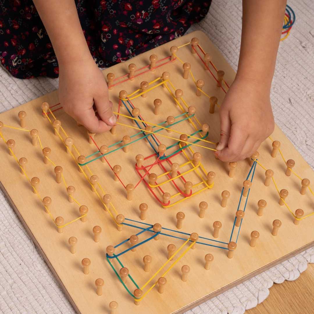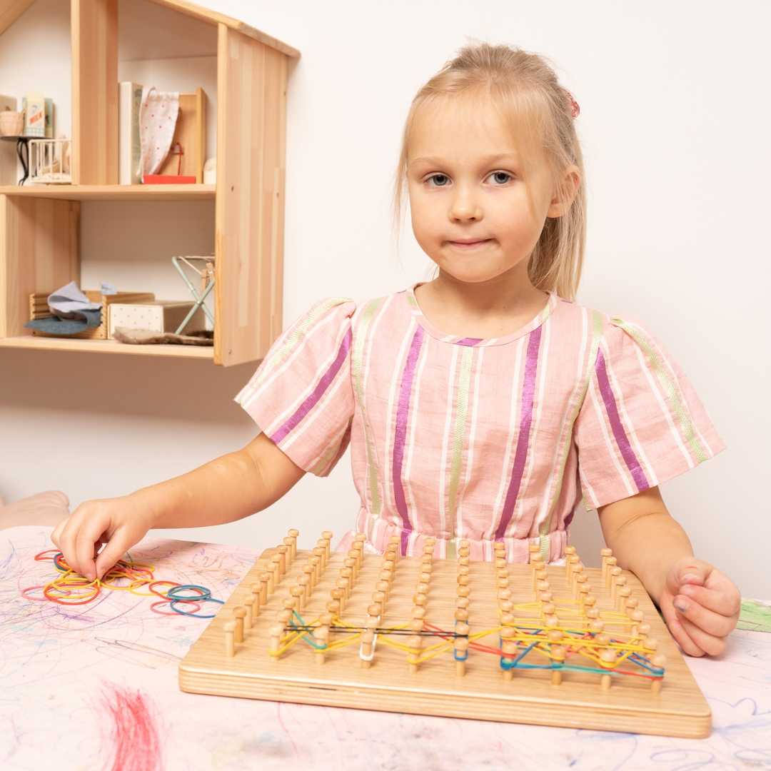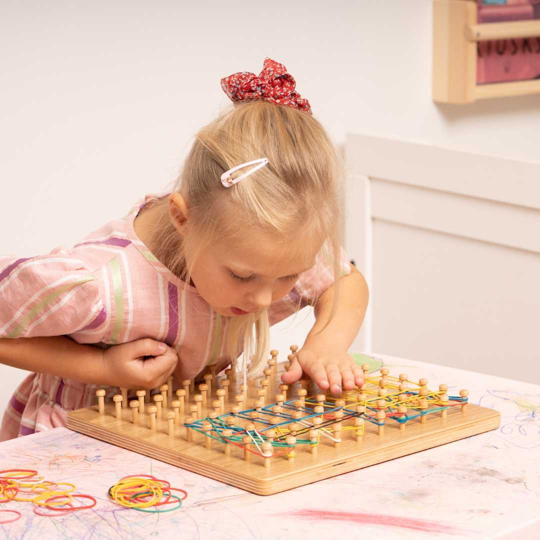 By stretching colourful bands around smooth wooden pegs, children naturally develop fine motor skills, concentration, and early mathematical thinking.